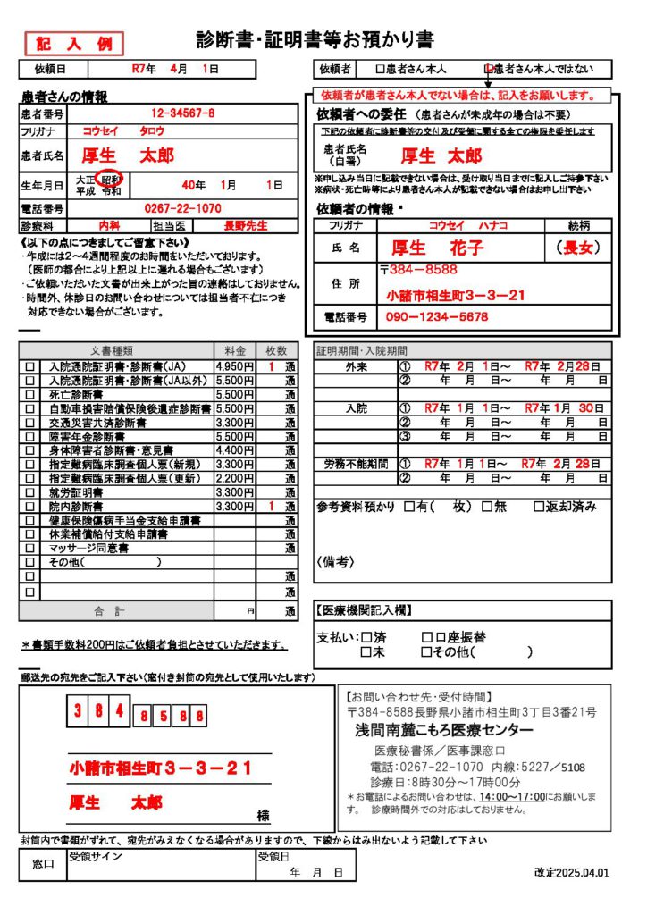 記入用 診断書・証明書等お預かり書PDFはこちらから